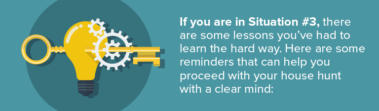 1. Don't linger on your previous rejection. Thinking of “that home” as “The One That Got Away” will prevent you from giving other houses a fair chance. That being said, it is important to move on completely and accept that you’ll have to find a different dream home.